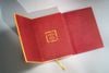 Bìa sách được thêu trên chất liệu vải gấm vàng, họa tiết rồng được thêu lắc tay với thân dài, vảy nhỏ, mây vờn, dáng uy nghiêm. Từng mũi thêu được thực hiện thủ công, tạo nên bề mặt nổi – chìm sống động, nơi ánh chỉ kim và sắc đỏ – vàng hoà quyện trên nền gấm. Mỗi cuốn sách là kết quả của nhiều ngày lao động lặng lẽ, mang dấu tay và nhịp thở của người thợ.