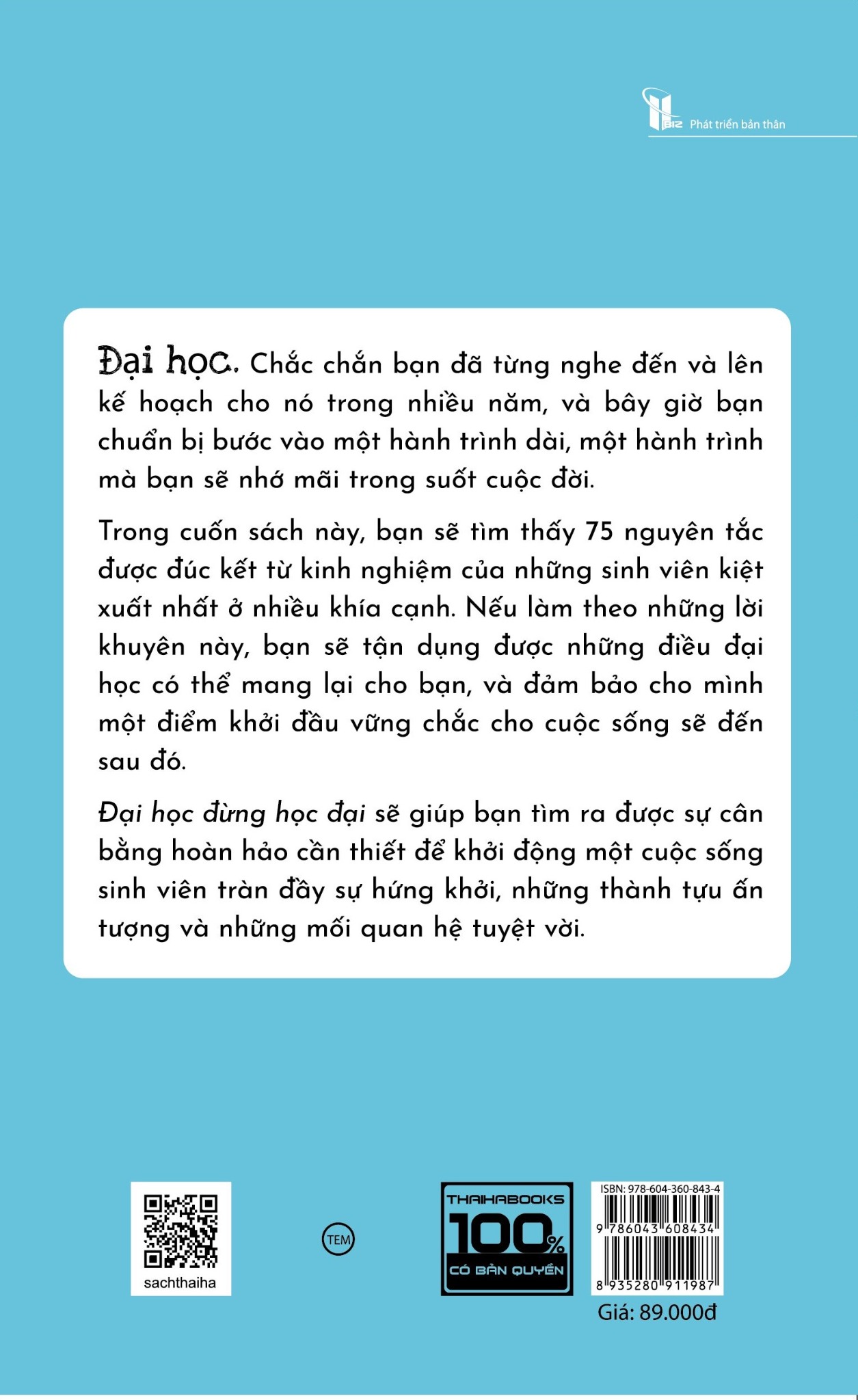 [ThaiHaBooks]  Đại học. Chắc chắn bạn đã từng nghe đến và lên kế hoạch cho nó trong nhiều năm, và bây giờ bạn chuẩn bị bước vào một hành trình dài, một hành trình mà bạn sẽ nhớ mãi trong suốt cuộc đời. Trong cuốn sách này, bạn sẽ tìm thấy 75 nguyên tắc được đúc kết từ kinh nghiệm của những sinh viên kiệt xuất nhất ở nhiều khía cạnh. Nếu làm theo những lời khuyên này, bạn sẽ tận dụng được những điều đại học có thể mang lại cho bạn, và đảm bảo cho mình một điểm khởi đầu vững chắc cho cuộc sống sẽ đến sau đó. Đại học đừng học đại sẽ giúp bạn tìm ra được sự cân bằng hoàn hảo cần thiết để khởi động một cuộc sống sinh viên tràn đầy sự hứng khởi, những thành tựu ấn tượng và những mối quan hệ tuyệt vời. “Tất cả sinh viên, và tất cả cha mẹ của sinh viên, cần phải mua cuốn sách này.”