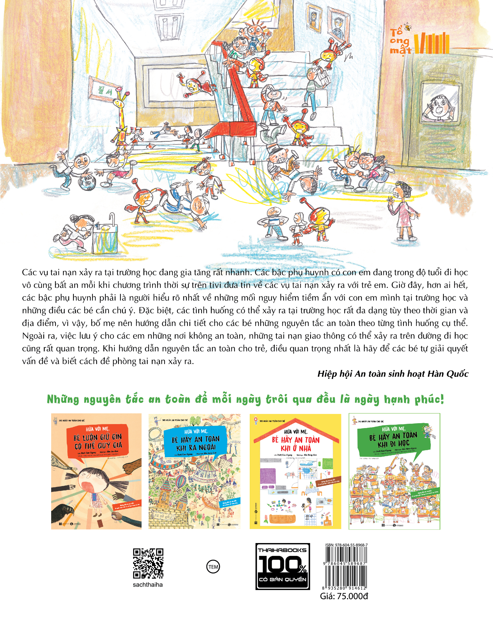 [ThaiHaBooks] “HỨA VỚI MẸ, BÉ HÃY AN TOÀN KHI ĐI HỌC” dành cho bé 3+, nằm trong bộ sách “365 ngày an toàn cho bé”. Bộ sách hướng dẫn các phụ huynh và các bé các quy tắc giữ an toàn cho các bé trong các trường hợp cụ thể: Ở trường học, ở nhà, khi đi ra ngoài và bảo vệ bản thân khỏi bạo lực, bắt cóc và lạm dụng.