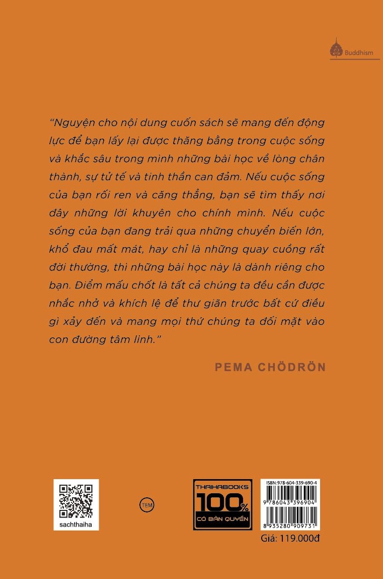 “Năm 1995, tôi nghỉ phép một năm. Suốt 12 tháng, tôi gần như không làm gì cả. Với tôi, đó là khoảng thời gian mang đến nhiều cảm hứng tâm linh nhất trong cuộc đời. Tất cả những gì tôi làm là thư giãn. Tôi đọc sách, leo núi và ngủ. Tôi nấu và ăn, thiền định và viết sách. Tôi không có thời gian biểu hay lịch trình nào, cũng không có những “việc nên làm”. Trong suốt khoảng thời gian hoàn toàn tự do và thoải mái khám phá này, tôi đã thấu suốt được nhiều điều. Tôi bắt đầu thư thả đọc lại hai thùng các-tông chứa những bản ghi chép thô chưa qua chỉnh sửa, đó là những bài giảng của tôi từ năm 1987 đến năm 1994. Không như những bài giảng trong khóa thiền định một tháng Dathun đã được viết lại trong cuốn The Wisdom of No Escape (tạm dịch: Trí tuệ từ việc không trốn chạy) và những bài giảng giáo lý lojong (các phương pháp luyện tâm) trong cuốn Start Where You Are (tạm dịch: Bắt đầu từ chính nơi bạn đang đứng), những bài giảng này dường như không cùng một chủ đề. Thi thoảng tôi lại xem qua một vài bản ghi chép. Những lời giảng với đủ mọi hình thái từ mô phạm đến thú vị. Tôi cảm thấy thích thú lẫn ngượng ngùng trước vô khối những từ ngữ từng được thốt ra bởi chính mình. Dần dần, khi đọc thêm, tôi bắt đầu thấy ở một góc độ nào đó, dù tôi chọn chủ đề nào, dù thuyết pháp ở đất nước nào, hay tại thời điểm nào, tôi đã không ngừng giảng về cùng một thứ: Tính cấp thiết của việc phát triển tình yêu và sự tử tế cho bản thân, hay maitri, và từ đó thức tỉnh thái độ bi mẫn1 không sợ hãi trước khổ đau của bản thân mình và người khác. Đâu đó đằng sau mỗi bài giảng là cùng một góc nhìn: Chúng ta có thể bước vào một lãnh địa chưa được khai phá và thả lỏng trong hoàn cảnh bấp bênh của mình. Một chủ đề tiềm ẩn khác là hóa giải căng thẳng trong xu hướng phân biệt nhị nguyên giữa chúng ta và họ, giữa đây và kia, tốt và xấu, bằng cách nghênh tiếp những gì chúng ta thường né tránh. Thầy tôi, Chögyam Trungpa Rinpoche, đã mô tả phương pháp này là “tựa vào những điểm sắc nhọn”. Trong suốt quãng thời gian bảy năm đó, tôi nhận ra, tôi đã cố gắng thấu hiểu và truyền đạt những chỉ dẫn đầy mạnh mẽ và hữu ích mà thầy Trungpa Rinpoche đã dạy cho học trò.