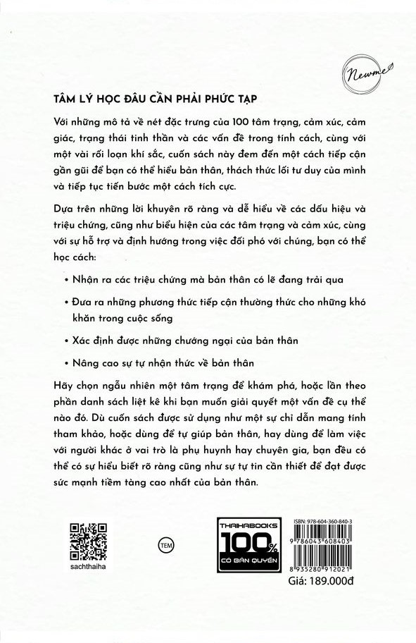 Với những mô tả về nét đặc trưng của 100 tâm trạng, cảm xúc, cảm giác, trạng thái tinh thần và các tật trong tính cách, cùng với một vài rối loạn khí sắc, cuốn sách này đem đến một cách tiếp cận gần gũi để bạn có thể hiểu bản thân, thách thức lối tư duy của mình và tiếp tục tiến bước theo một cách tích cực.