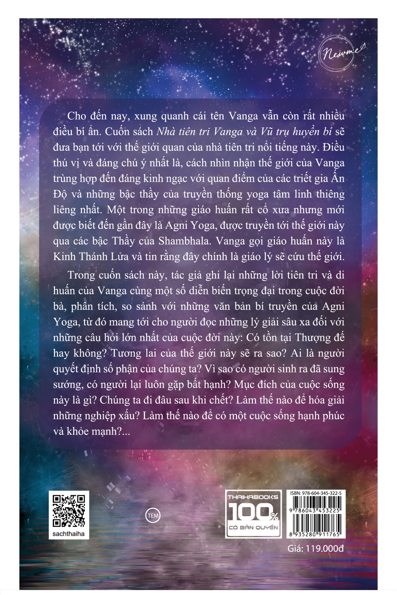 Nhà tiên tri Vanga và Vũ trụ huyền bí sẽ hé mở cho bạn tấm màn bí mật ấy. Cuốn sách dựa trên những lời tiên tri và giáo huấn của Vanga, so sánh và kết hợp với một triết thuyết cổ xưa, Agni Yoga, để vẽ nên một bức tranh tương đối đầy đủ về những điều cực kỳ quan trọng, nhưng có lẽ không nhiều người biết, về cuộc sống này.