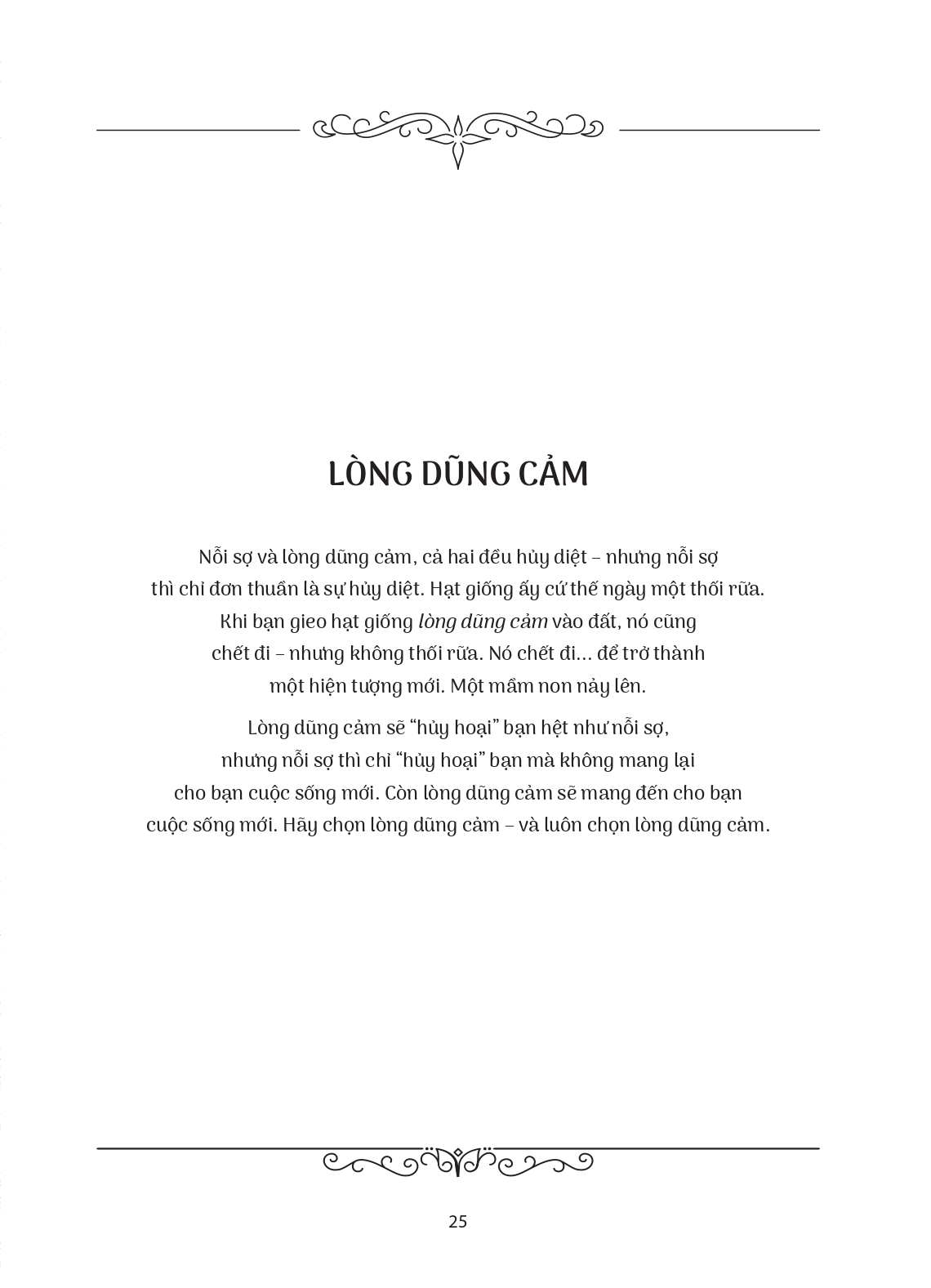 3. Lòng dũng cảm sẽ “hủy hoại” bạn hệt như nỗi sợ, nhưng nỗi sợ thì chỉ “hủy hoại” bạn mà không mang lại cho bạn cuộc sống mới. Còn lòng dũng cảm sẽ mang đến cho bạn cuộc sống mới. Hãy chọn lòng dũng cảm – và luôn chọn lòng dũng cảm. (Trang 25)