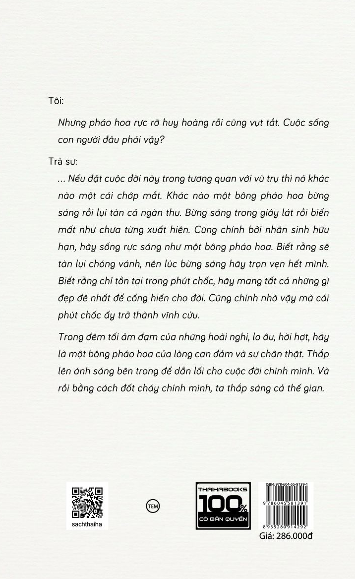 [ThaiHaBooks] Cuốn sách “Sống như bông pháo hoa” là một cuộc hành trình khám phá điều quý giá nhất cuộc đời. Trong phòng trà giản dị, yên bình giữa núi rừng Đà Lạt, chúng ta được xem thước phim tua chậm về cuộc trò chuyện giữa tác giả và Trà sư. Độc giả như thấy chính mình qua những trải lòng và suy tư của tác giả Ruby Nguyen, tuy có lúc chông chênh và mất phương hướng nhưng mỗi người là một mảnh ghép không thể thiếu trong bức tranh cuộc đời rộng lớn. Những lời khuyên đầy tính triết lý, nhân văn của Trà sư khiến chúng ta hiểu ra một điều: Chỉ có tình yêu thương và tấm lòng rộng mở mới khiến chúng ta tìm được bình yên nơi tâm hồn và làm cuộc đời này trở nên ý nghĩa, đáng sống.