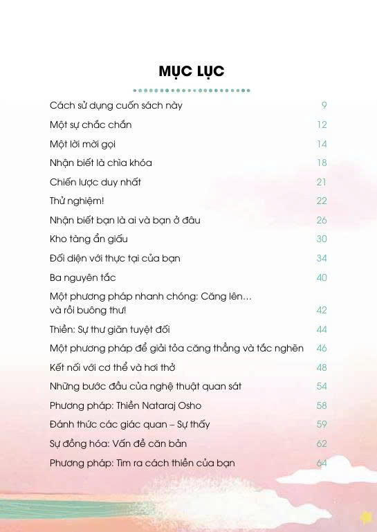1. Cuốn sách đưa ra những chỉ dẫn tổng quát về thiền cũng như những kỹ thuật thực hành cụ thể, những kiến giải sâu sắc về các thói quen khiến chúng ta không ngừng rơi vào căng thẳng và xung đột, đồng thời cho thấy cuộc sống sẽ như thế nào nếu chúng ta có thể nhận ra những thói quen đó và từ bỏ chúng. (trang 9)