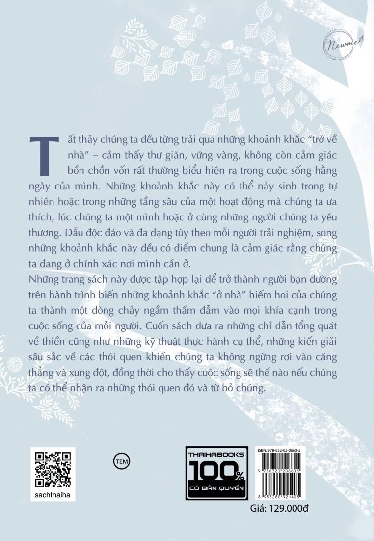 Những trang sách này, được tập hợp lại để trở thành người bạn đường trên hành trình biến những khoảnh khắc “ở nhà” hiếm hoi của chúng ta thành một dòng chảy ngầm thấm đẫm vào mọi khía cạnh trong cuộc sống của mỗi người. Cuốn sách đưa ra những chỉ dẫn tổng quát về thiền cũng như những kỹ thuật thực hành cụ thể, những kiến giải sâu sắc về các thói quen khiến chúng ta không ngừng rơi vào căng thẳng và xung đột, đồng thời cho thấy cuộc sống sẽ thế nào nếu chúng ta có thể nhận ra những thói quen đó và từ bỏ chúng.